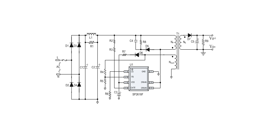 SP2618F是一款性能優(yōu)異的原邊反饋控制電路,應(yīng)用于小功率AC/DC充電器與適配器。控制電路使用原邊采樣技術(shù)進行精確的恒流、恒壓控制,可以省去一般應(yīng)用中的光耦與TL431。