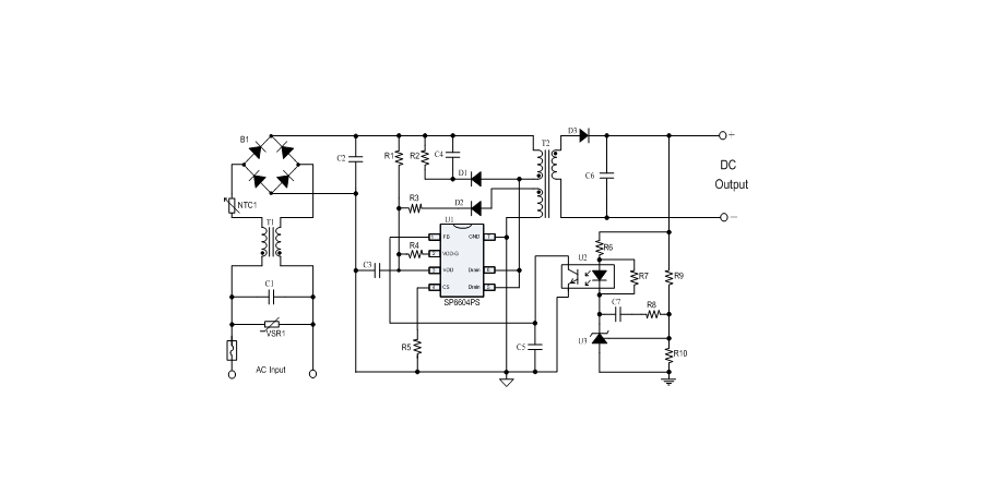 SP6604PS在PWM模式下工作于固定頻率,這個頻率是由內部精確設定的。在空載或者輕載時,工作頻率由IC內部調整。芯片可以工作在綠色模式,以此來減小輕載時的損耗,提高整機的工作效率,SP6604PS在啟動和工作時只需要很小的電流,可以在啟動電路中使用一個很大的電阻,以此來進一步減小待機時的功耗。芯片內置有斜坡補償電路,當電路工作于大占空比時,避免次諧波振蕩的發生,改善系統的穩定性。內置有前沿消隱時(Leading-edge blanking time),消除緩沖網絡中的二極管反向恢復電流對電路的影響。SP6604PS采用了抖頻技術,能夠有效改善系統的EMI性能。系統的跳頻頻率設置在音頻(20KHz)以上,在工作時可以避免系統產生噪音。SP6604PS內置多種保護,包括逐周期限流保護(OCP),過載保護(OLP),過壓保護(OVP),VDD過壓箝位,欠壓保護(UVLO),過溫保護(OTP)等,通過內部的圖騰柱驅動結構可以更好的改善系統的EMI特性和開關的軟啟動控制。