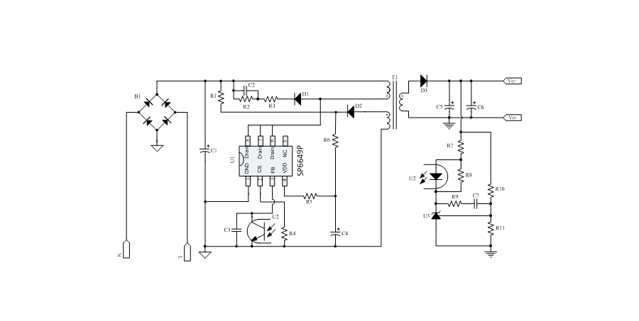 SP6649P內(nèi)置多種保護(hù),包括逐周期限流保護(hù)(OCP),過(guò)載保護(hù)(OLP),過(guò)壓保護(hù)(VDD OVP),VDD過(guò)壓箝位,欠壓保護(hù)(UVLO),過(guò)溫保護(hù)(OTP)等,通過(guò)內(nèi)部的圖騰柱驅(qū)動(dòng)結(jié)構(gòu)可以更好的改善系統(tǒng)的EMI特性和開關(guān)的軟啟動(dòng)控制。