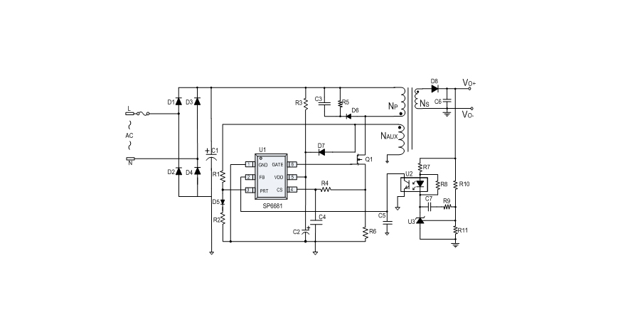 SP6681提供了完整的保護功能,包括逐周期過流保護(OCP),過載保護(OLP),外部過溫保護(OTP),輸出短路保護(SCP),輸出過壓和VDD過壓保護。IC內部頻率轉換技術實現了優異的EMI效果,內部工作頻率控制技術使得23KHz頻率以下的能量最小化,來避免工作時產生噪聲。