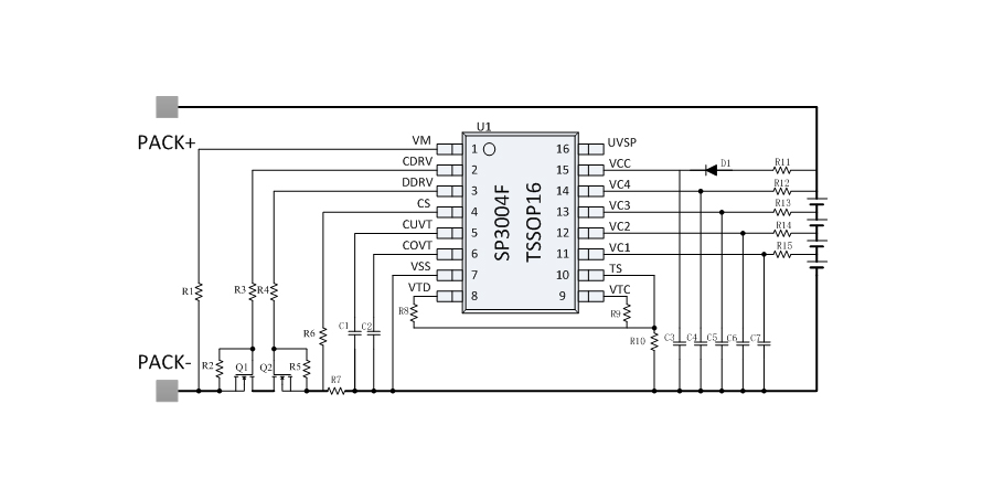 SP3004F是一款用于4串鋰電池的保護(hù)芯片,SP3004F 內(nèi)部集成了高精度的電壓、電流檢測(cè)電路,能夠?qū)崿F(xiàn)每串電池的過壓、欠壓保護(hù),以及整串電池的充電過流、放電過流、短路保護(hù)和充放電的溫度保護(hù)等。SP3004F 內(nèi)部集成 N 型MOSFET 的驅(qū)動(dòng)電路,能夠直接驅(qū)動(dòng)外部 N 型充電管和放電管,既可以兼容充放電分口應(yīng)用,也可以兼容充放電同口應(yīng)用。