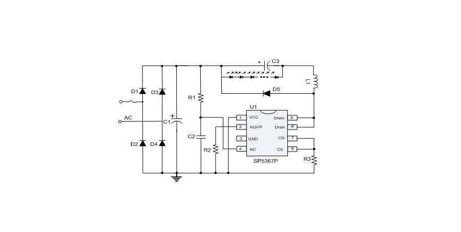 SP5367P內部集成了一個500V高壓功率開關管,而且芯片的工作電流極低,降低了系統損耗,提高了效率。無需輔助繞組供電,減少了外圍元件的使用。采用了新型的電流檢測方式和驅動,即使在成本和體積都縮減的情況下也可實現優異的恒流特性。SP5367P內置高精度的電流采樣電路和特殊的恒流控制技術,實現高精度的恒流輸出。芯片工作在電感電流臨界連續模式,輸出電流不會隨著電感量和輸出負載的變化而變化。