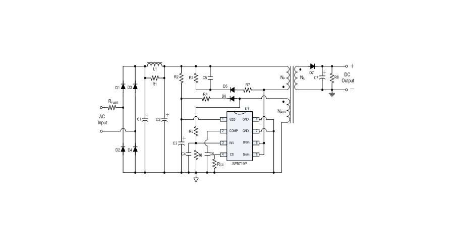 SP5719P是一顆高精度離線(xiàn)式開(kāi)關(guān)電源電路,應(yīng)用于低功耗AC/DC充電器與適配器。SP5719P使用原邊取樣來(lái)進(jìn)行精確的恒流、恒壓控制,可以省去一般應(yīng)用中的光耦與TL431。
