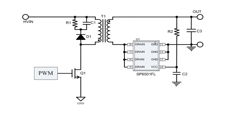 SP6501FL檢測內(nèi)置MOSFET的導(dǎo)通電阻(Rds-on)上的壓降,來控制MOSFET的開關(guān)。應(yīng)用外圍簡單。適用于5V輸出的應(yīng)用方案。