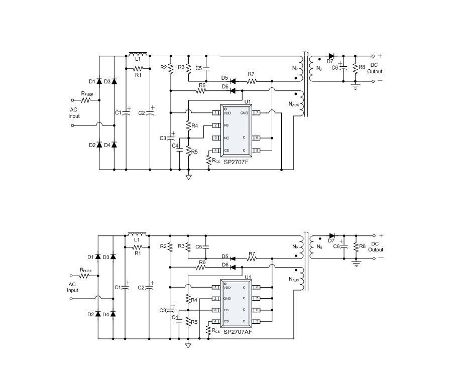 SP2707F提供多種保護功能,包括逐周期限流保護(OCP),VDD過壓保護,VDD欠壓保護(UVLO),VDD過壓鉗位保護,交流輸入欠壓保護(Brown-out),交流輸入過壓保護(Line-OVP),輸出電壓啟動過沖保護,輸出短路保護,過溫保護(OTP)保護等。