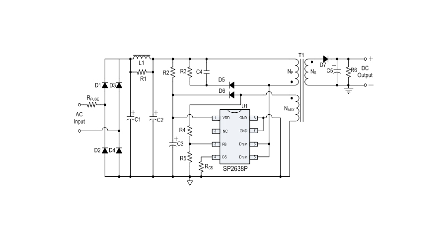 SP2638P是一款性能優異的原邊反饋控制電路,應用于小功率AC/DC充電器與適配器。控制電路使用原邊采樣技術進行精確的恒流、恒壓控制,可以省去一般應用中的光耦與TL431。