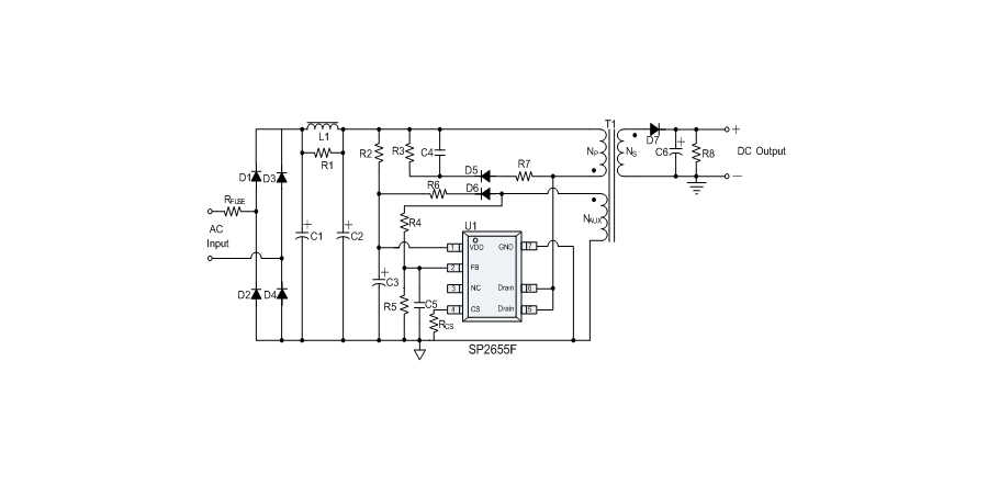 SP2655 提供全面的保護功能,包括逐周期限流保護(OCP)、VDD 過壓保護(OVP)、VDD 欠壓保護(UVLO)、反饋環(huán)路開路保護、輸出短路保護、輸出過壓保護、過溫保護等。其中,輸出短路保護、輸出過壓保護具有自動重啟恢復的功能。